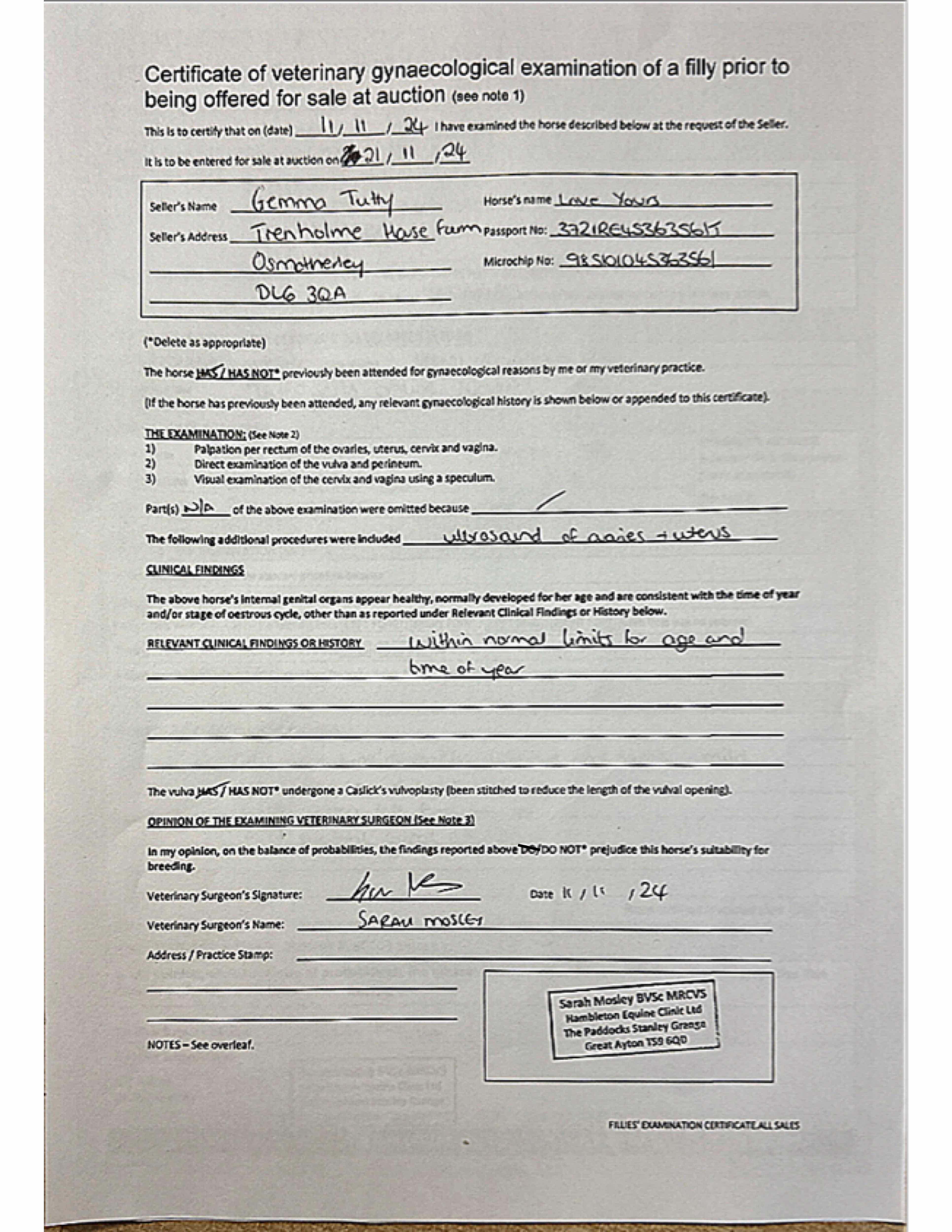Fillies Examination Cert