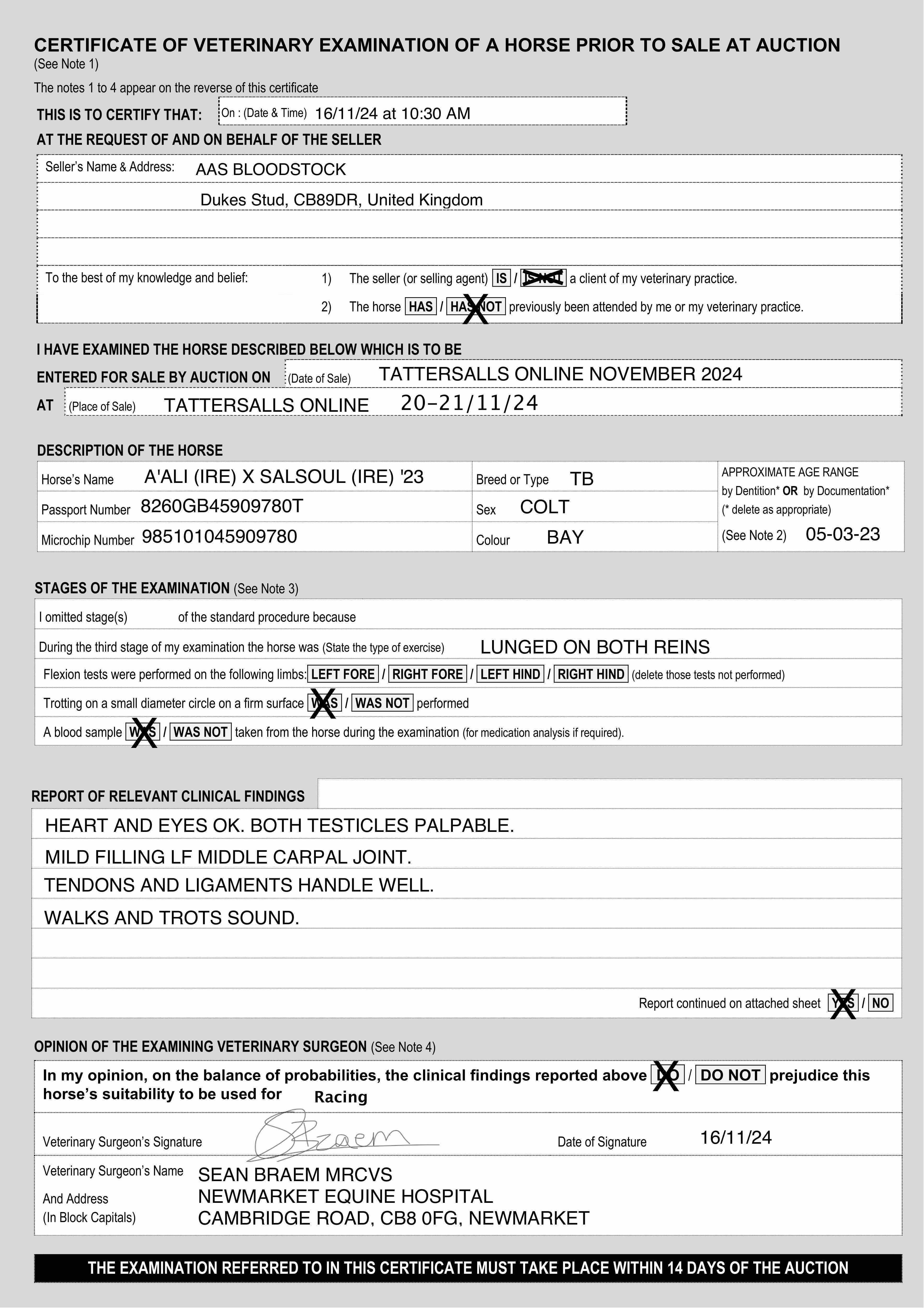 Vices/Declarations: This lot is not vaccinated in accordance with the current BHA influenza requirements and further vaccinations will be required before it can enter a UK racecourse. No valid EIA Coggins received.