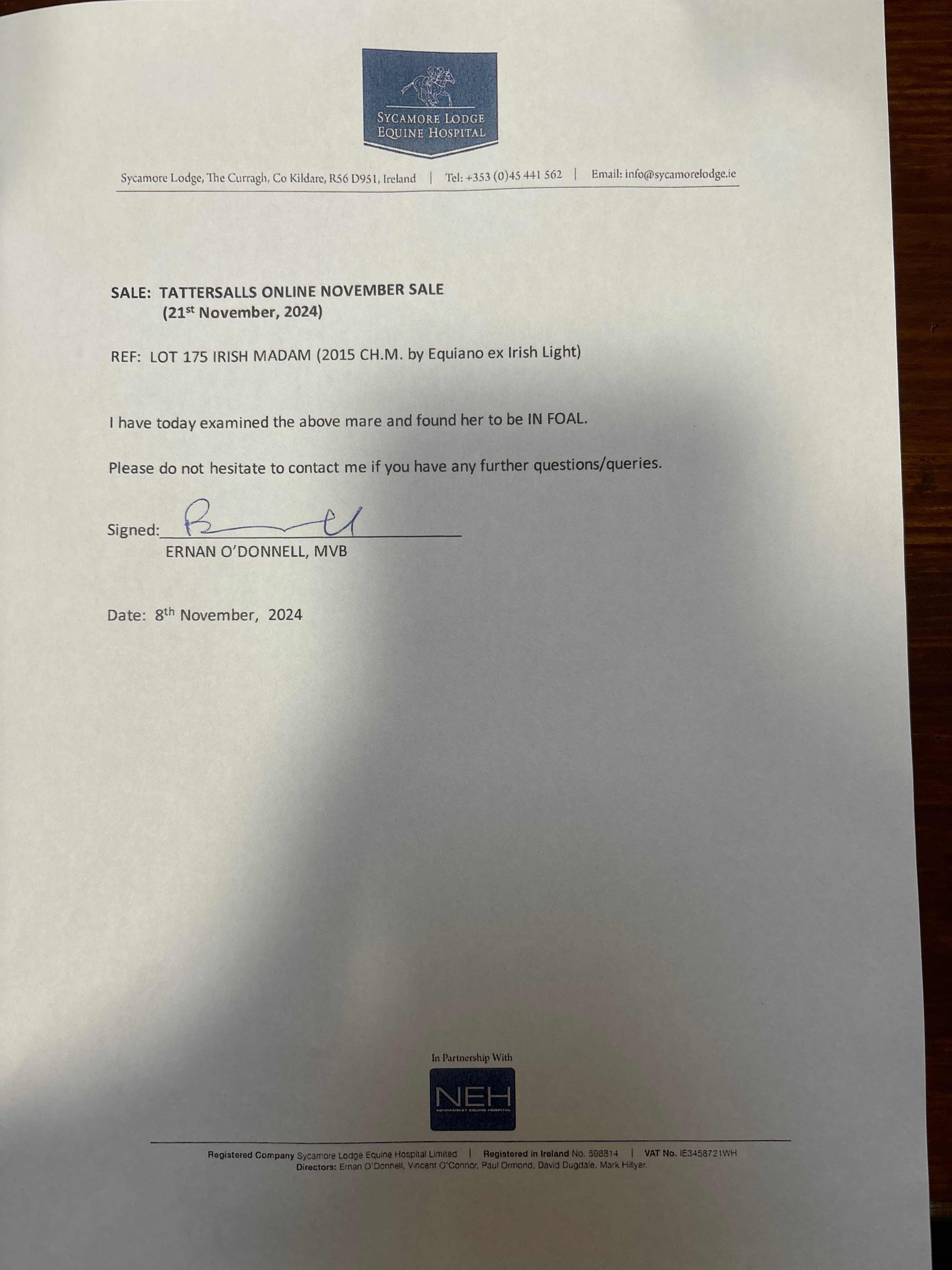 Vendor's Notes: Irish Madam is the dam of 2 foals of racing age and 1 winner Global Effort. Her 2023 Bated Breath realised €25k as a yearling. She is in foal to Nando Parrado.