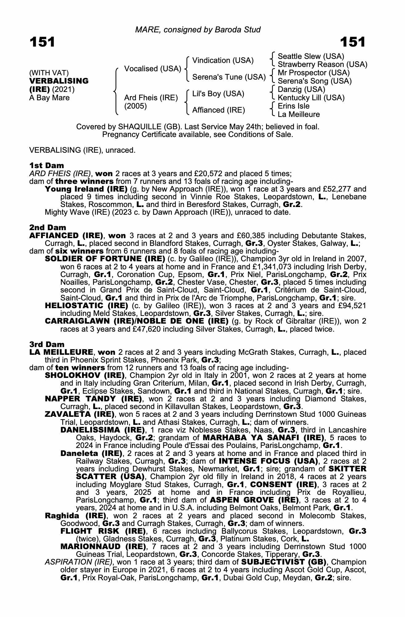 Vendor's Notes: VERBALISING is out of a sister to the multiple Stakes placed Young Ireland and from a very good female family that includes Group 1 winning fillies Marhaba Ya Sanafi, Skitter Scatter and Aspen Grove.