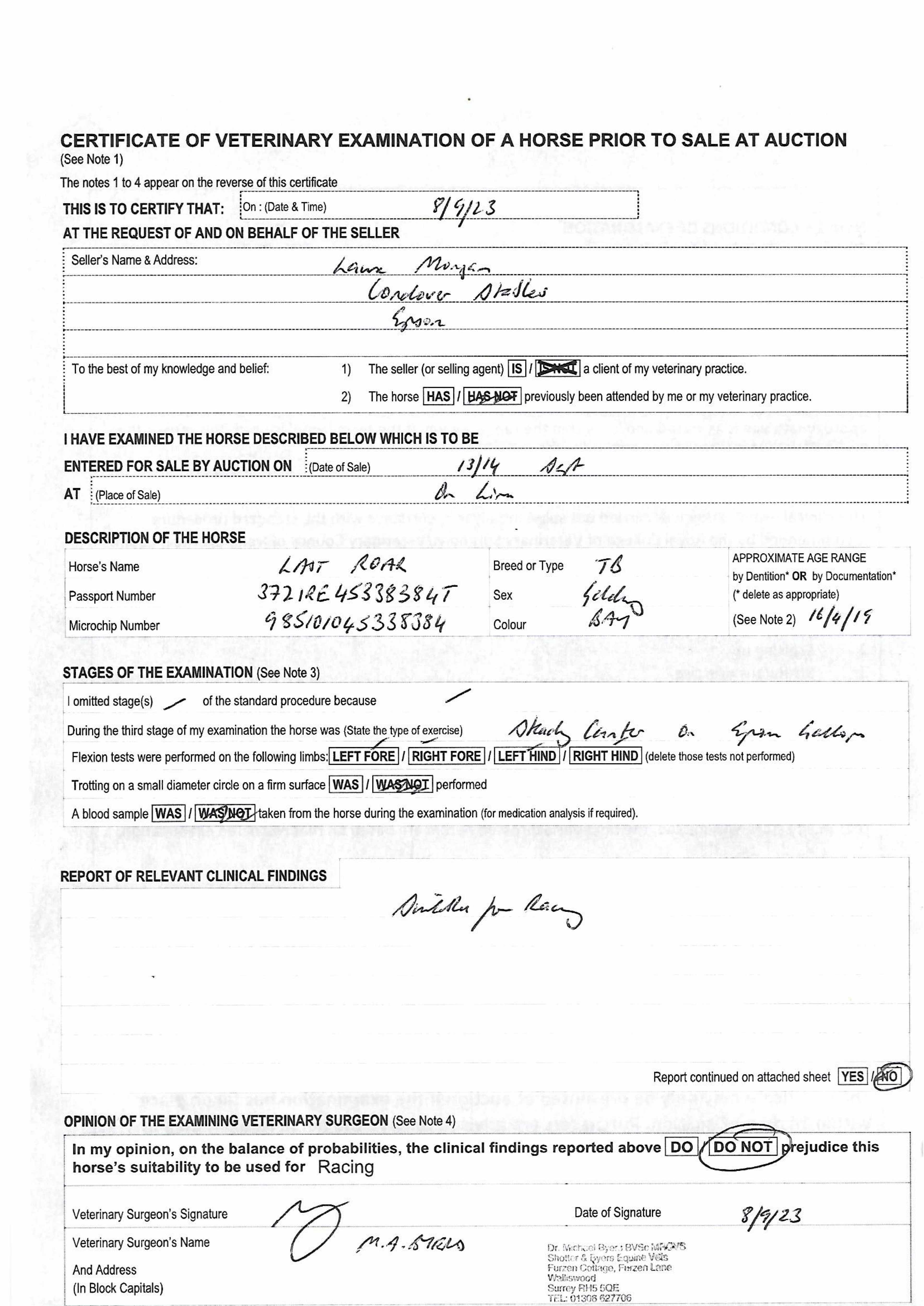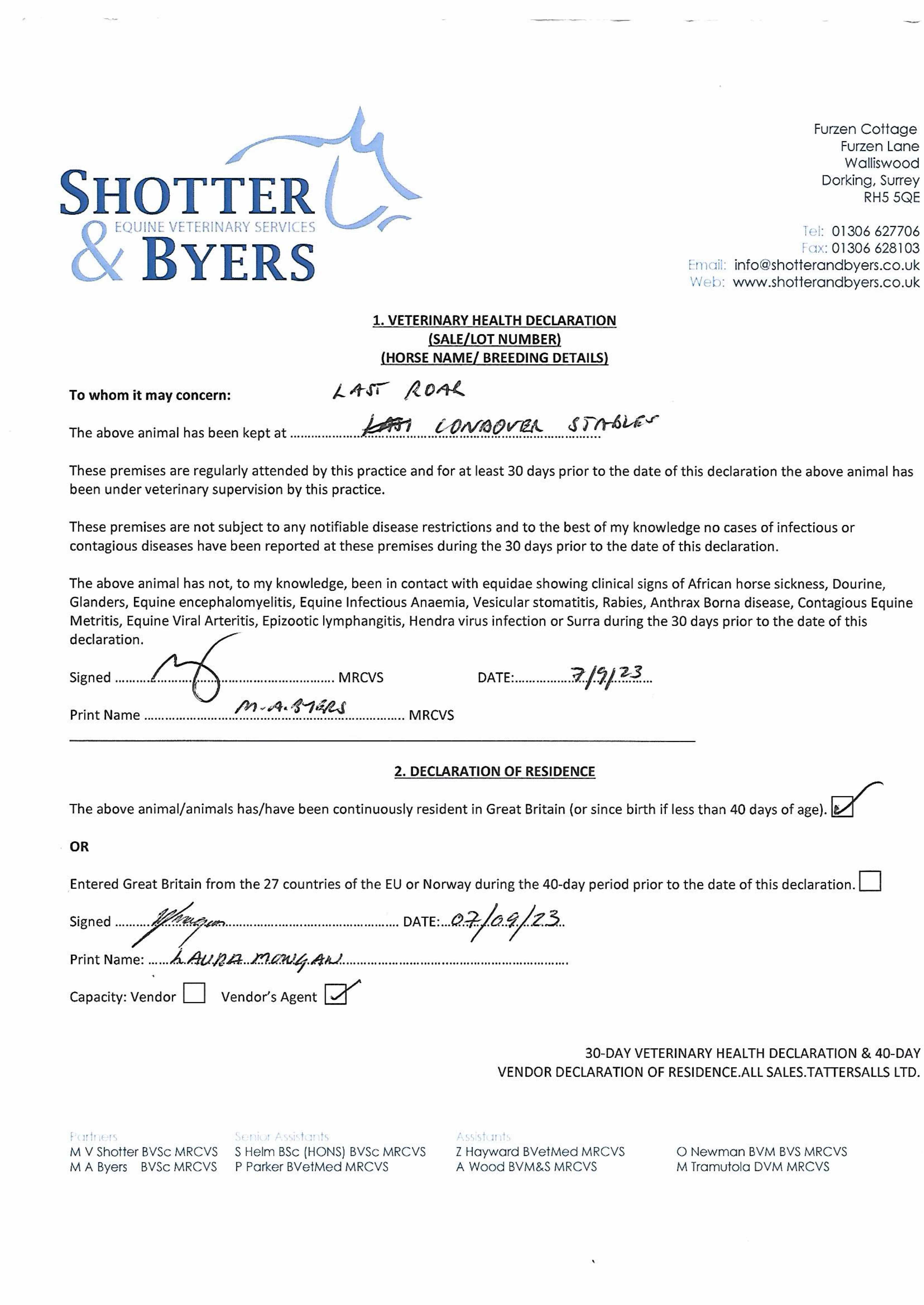 Vendor's Notes: Last Roar is in full training and will run up until the sale