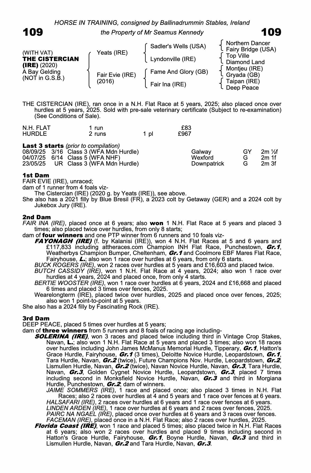 Vendor's Notes: Finished very promising third on his most recent start in a maiden hurdle at Galway on only his second start over hurdles having unseated with every chance at the last on his first start.