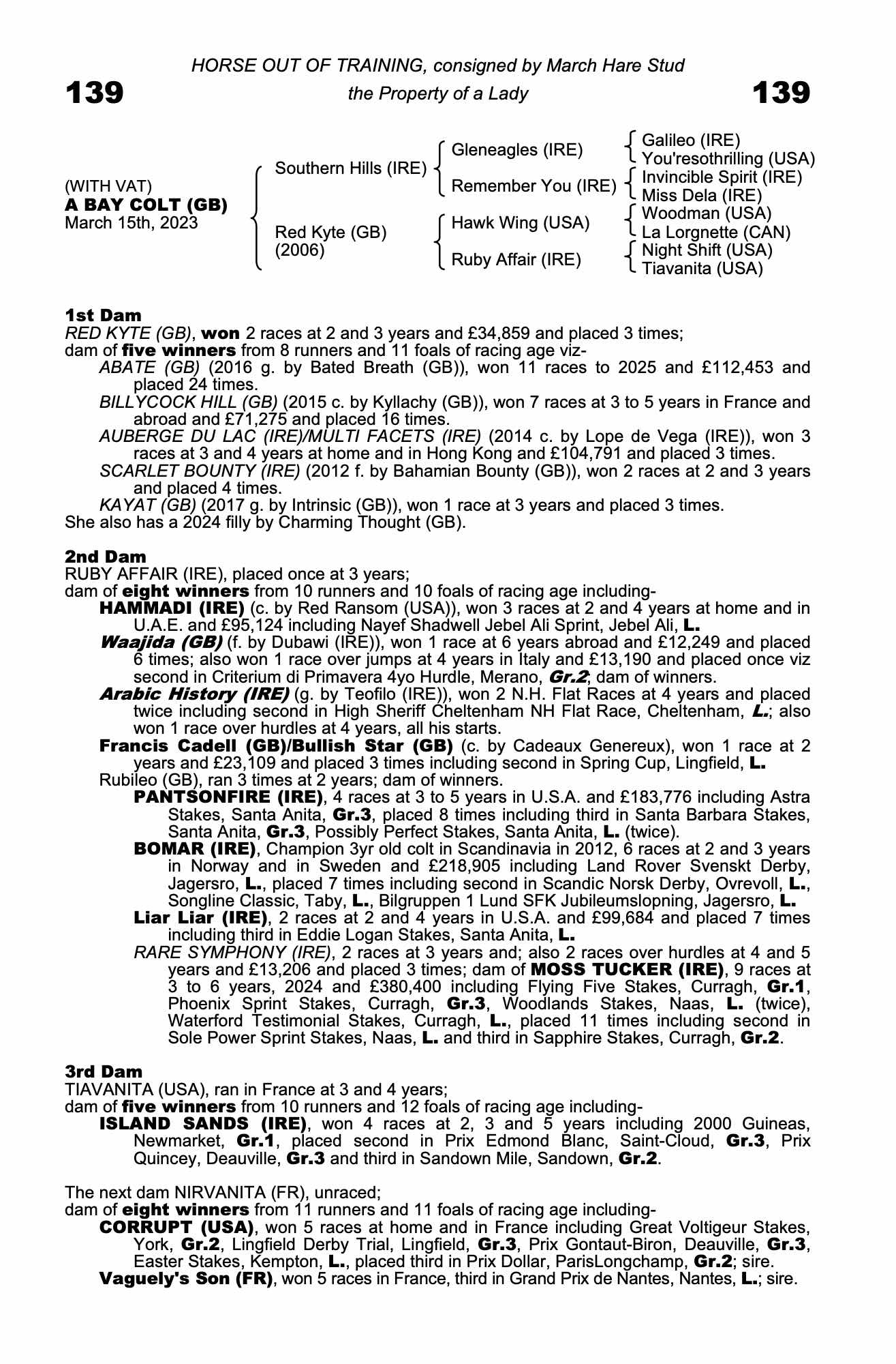 Vendor's Notes: Nice 2yo sharp colt by Southern Hills (Gleneagles) who was the 2yo Windsor Castle winner. He is out of Red Kyte good race mare herself who has produced multiple winners including tough and consistent sprinter Abate. He is from a fast sprinting family .He has been lunged and long reigned with tack and sure to make a nice racehorse . He has good size and strength and dam has a consistent record with her winners.