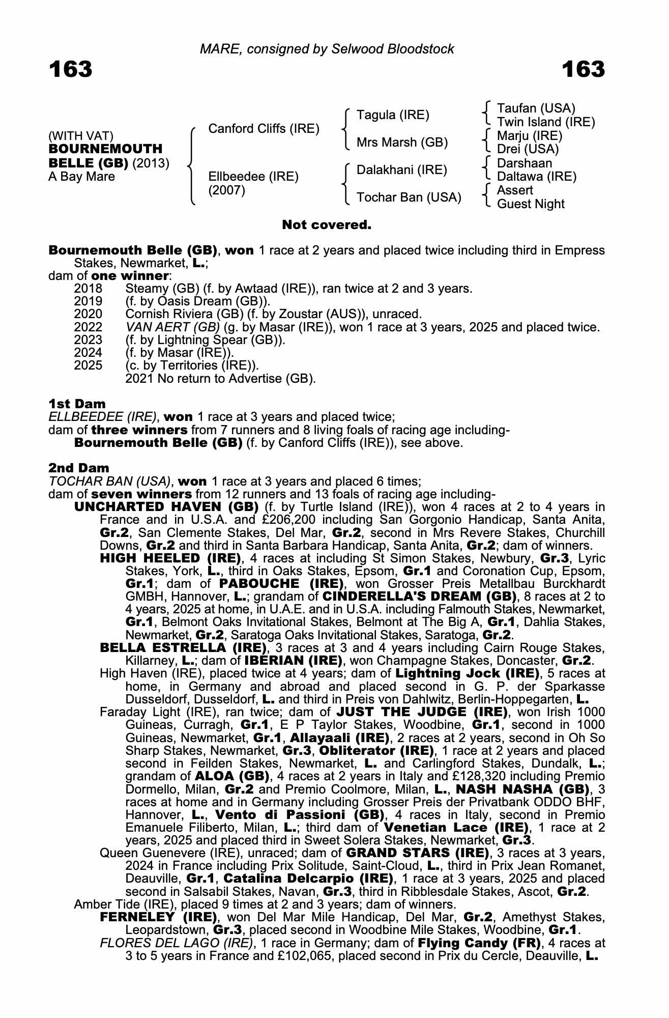 Vendor's Notes: 12 year old bay blacktype mare. Placed third in the Empress Stakes Newmarket. Foaled a cracking Territories colt this year. Masar yearling filly headed to Tattersalls Book 3. No vices. Kind temperament. From the family of Just the Judge and High Heeled.
