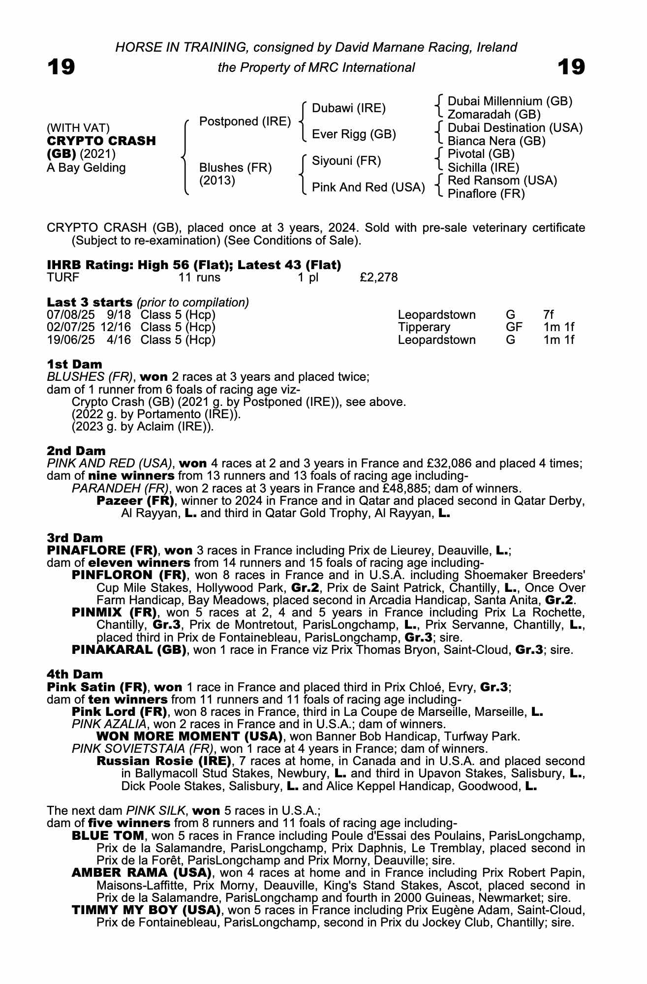 Vendor's Notes: Crypto Crash, by Postponed, a promising young National Hunt stallion, is an ideal sort to go jumping. He has size and scope and was second at Tipperary over 1m 4f.