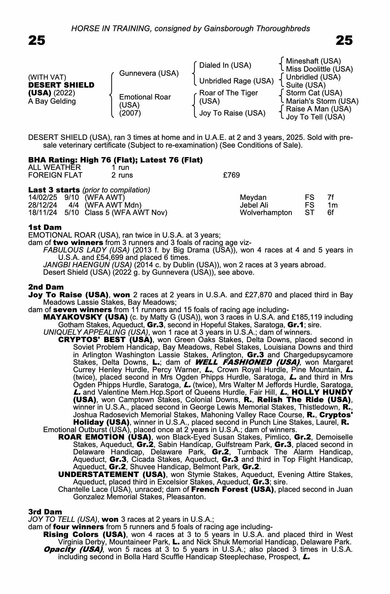 Vendor's Notes: DESERT SHIELD (USA) - 3yo bay/brown gelding by Gunnevera (USA) and out of Emotional Roar (USA). In full training.