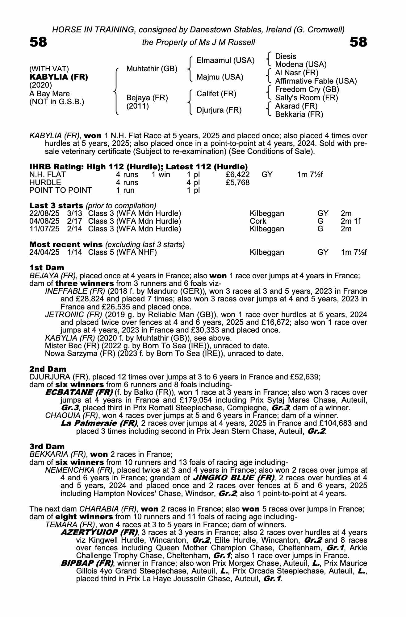 Vendor's Notes: Good looking daughter of Muhtathir who was an impressive bumper winner. Has been placed in all her hurdles starts and has the size and scope to jump fences.