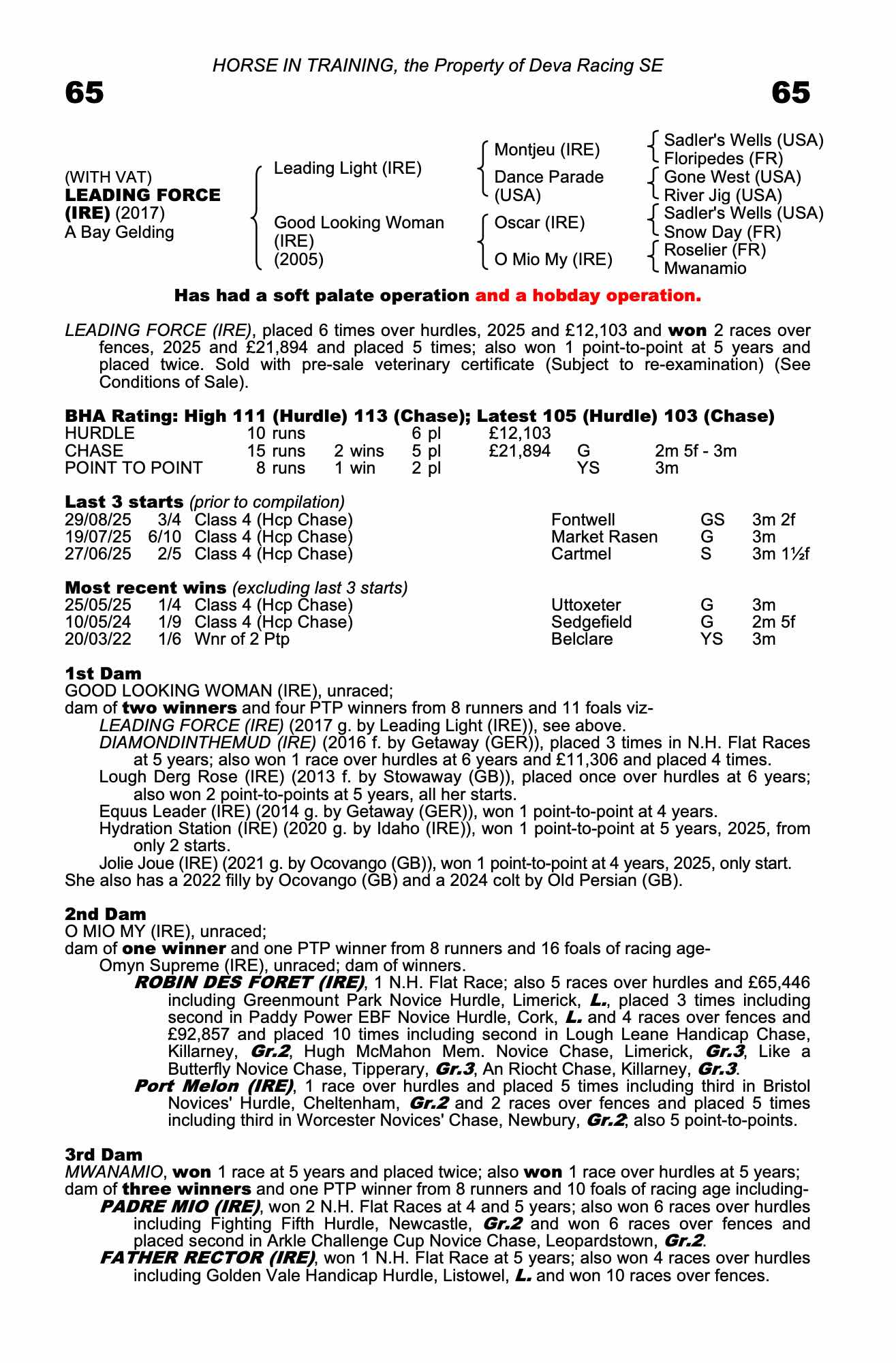 Vendor's Notes: Leading Force – A consistent and genuine performer who has already provided plenty of success. A three-time winner and multiple placer over both hurdles and fences, he remains attractively handicapped. An ideal National Hunt horse or a perfect schoolmaster for point-to-pointing. He will continue to run right up until the sale.