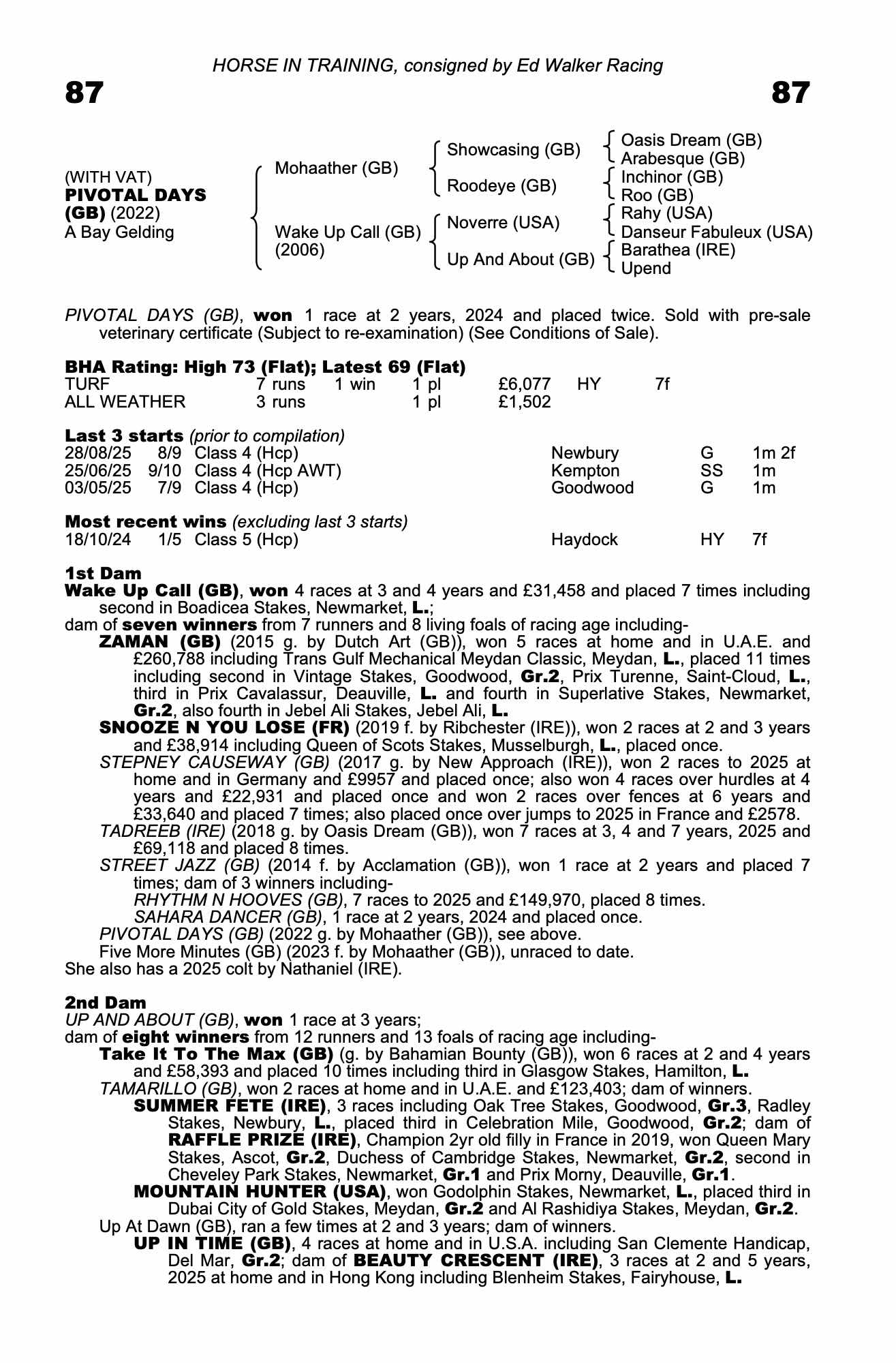 Vendor's Notes: Pivotal Days is sound and clean winded. He wants soft ground which he has not had this year really. Would benefit from some headgear and could run on the turf or all-weather.