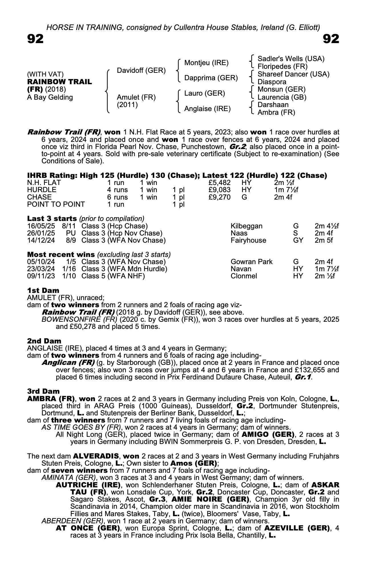 Vendor's Notes: Rainbow Trail is a 7yo son of Davidoff who has won 3 times on the track in a bumper, maiden hurdle and beginners chase. He has also placed in a Grade 2 novice chase in Punchestown over 3 miles.