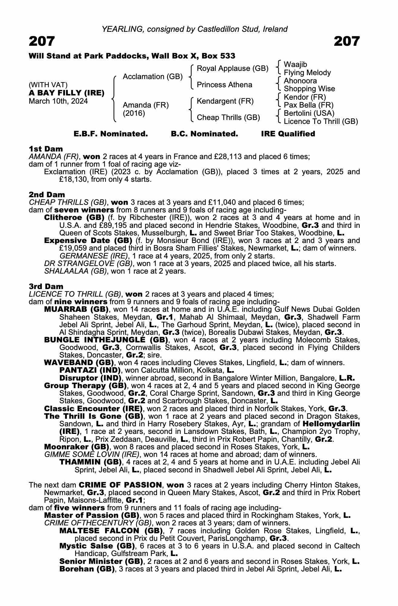 Monday 18 August:  Under 3rd dam, The Thrill Is Gone (GB), dam of NO MORE THRILLS (GB): ; dam of IPANEMA QUEEN (IRE), 2 races at 2 years, 2025 including Curragh Stakes, Curragh, L..
